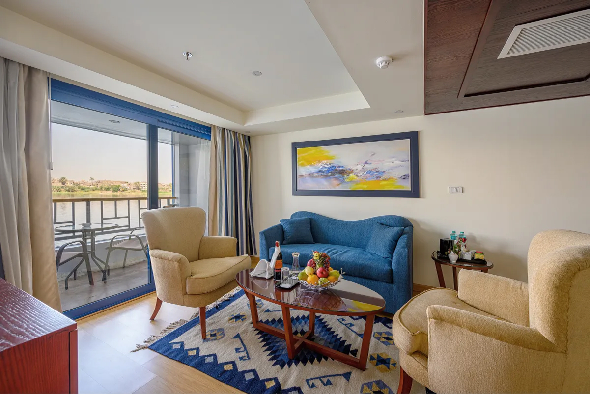 Nile Serenity offers excellent service to all of our guests . The program will allow you to visit many destinations in Luxor and Aswan or simply unwind on the boat. The cruise includes 40 suites with many facilities and modern interior design to provide a peaceful vacation. You will also find a restaurant, a lounge bar, and a sundeck to enjoy the marvelous view. Don’t miss the chance to enjoy the best entertainment and endless food  and drinks.